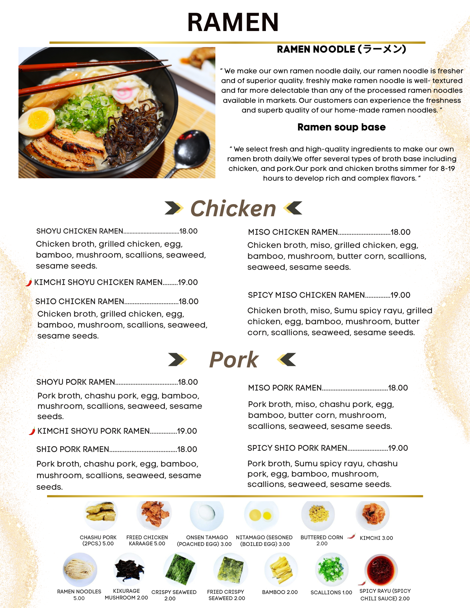 * Please let us know if you have allergies. Our food may contain MSG, eggs, soy, milk, sesame seed, wheat and/or nuts. Consuming raw or under cooked meats, poultry, seafood, shellfish or eggs may increase risk of food borne illness especially if you have certain medical conditions.*